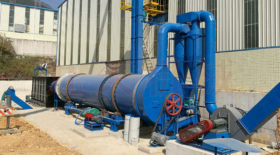 氣體流程是:空氣經(jīng)熱風爐鼓風機加壓進入熱風爐燃燒加熱,溫度達到600-650℃,被烘干機后引風機吸入烘干機烘干物料、蒸發(fā)水分,經(jīng)過三層換熱,風溫溫度降低到55-60℃排出烘干機,含塵濕氣經(jīng)過旋風除塵器收塵、濕式除塵器凈化達標排放。