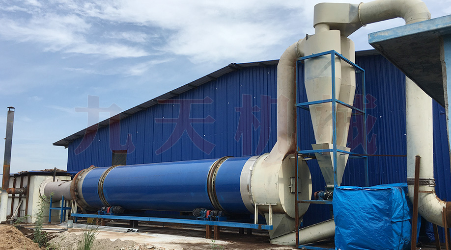 氣體流程是:烘干機(jī)配置高效節(jié)能熱風(fēng)爐,燃料可以是天然氣、柴油、煤炭、木材、秸稈、稻殼等,燃料燃燒產(chǎn)生溫度500-650℃貧氧熱煙氣,經(jīng)過沉淀除灰,被烘干機(jī)后引風(fēng)機(jī)吸入烘干機(jī)烘干物料、蒸發(fā)水分,溫度降低到50-65℃排出烘干機(jī),含塵濕氣經(jīng)過除塵器凈化達(dá)標(biāo)排放。